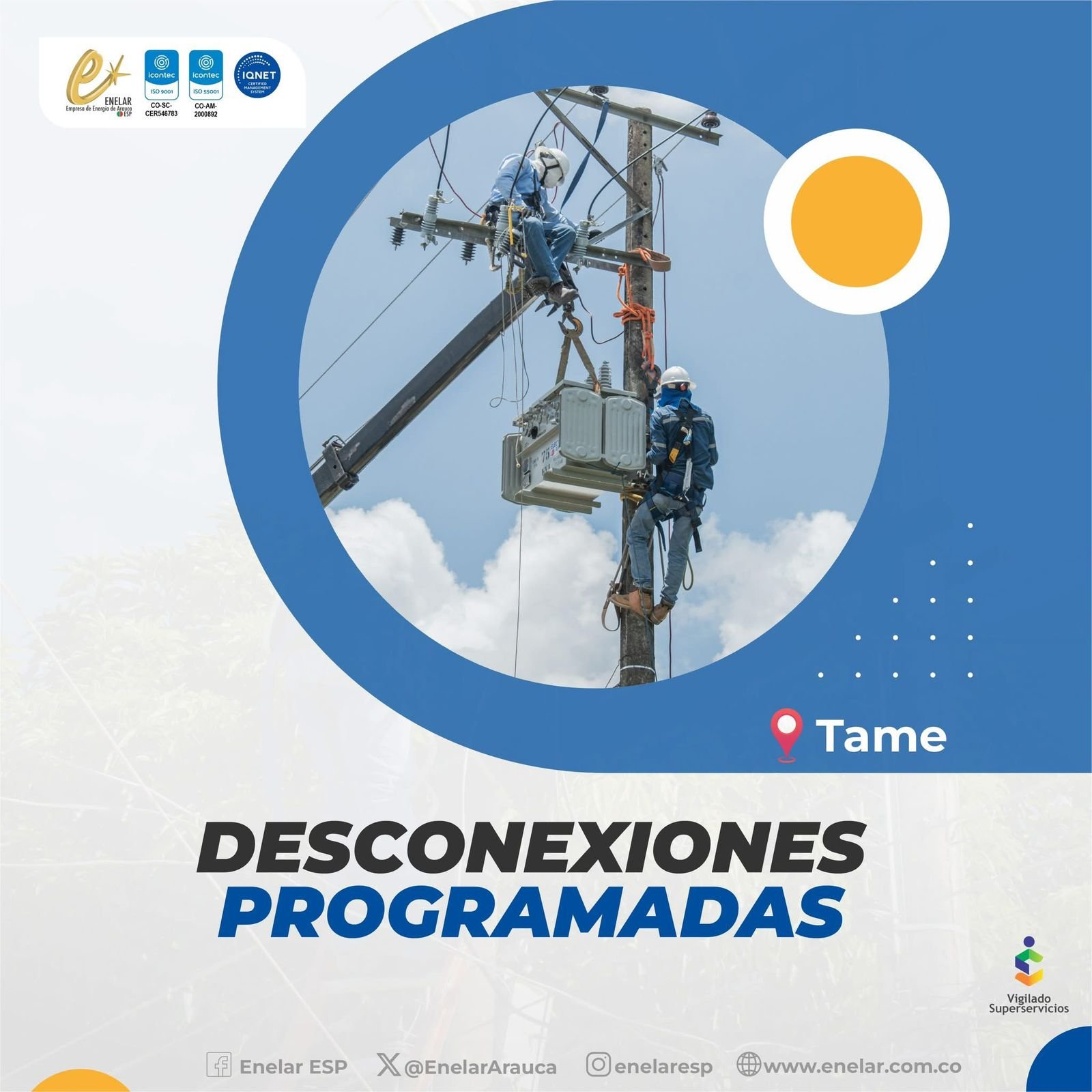 ENELAR ESP, informa a sus usuarios en el municipio de #Tame que, se hace necesario desconectar el servicio de energía de manera programada de acuerdo con el siguiente cronograma: