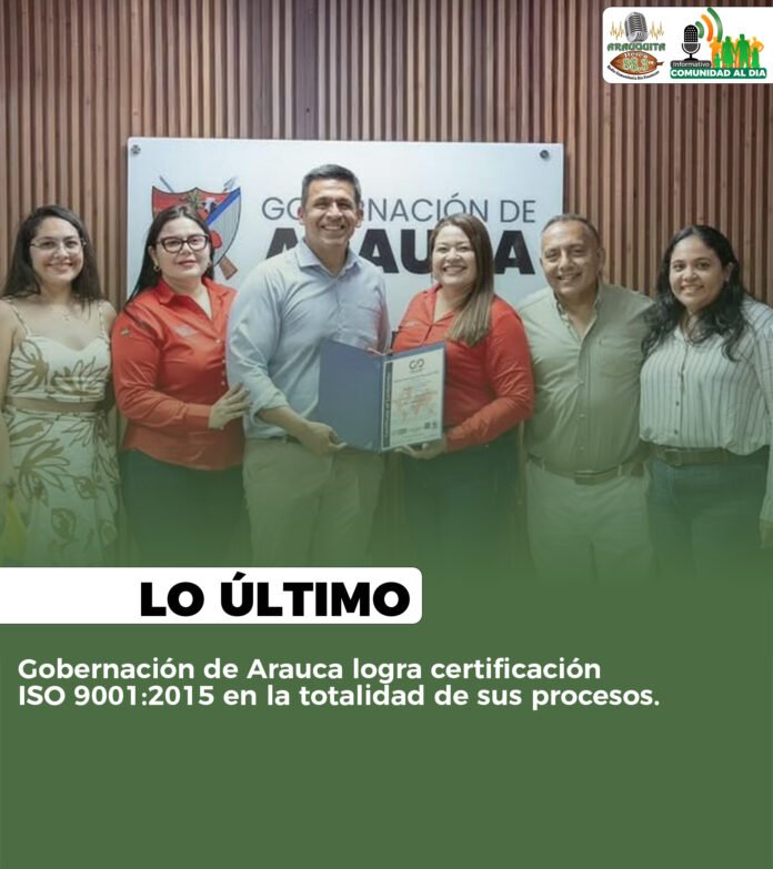 La Gobernación de Arauca alcanzó en 2026 un hito histórico en materia de gestión pública al obtener la certificación de la totalidad de sus 16 procesos bajo la norma ISO 9001:2015, anunció la gobernadora encargada Yeini Yiret Chivatá Calderón.